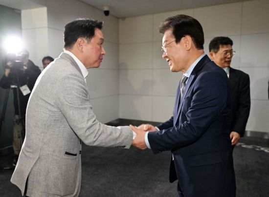 이재명 더불어민주당 대표와 최태원 SK그룹 회장이 4일 서울 강남구 삼성동 코엑스에서 열린 SK AI 서밋 참석에 앞서 악수하고 있다. 국회사진기자단