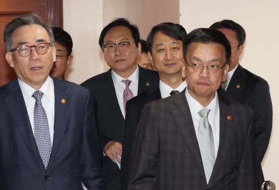 최상목 경제부총리 겸 기획재정부 장관을 비롯한 국무위원들이 7일 정부서울청사에서 열린 경제관계장관회의 겸 대외경제장관회의 참석을 위해 회의실로 향하고 있다. 이날 회의에서는 미 대선 결과 대응 및 한-미 주요 통상 현안 대응 방안에 대한 논의가 진행됐다.