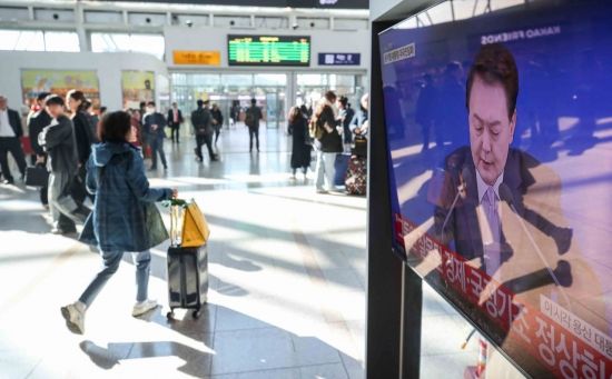 7일 서울 용산구 서울역 대합실에서 윤석열 대통령의 대국민 담화가 중계되고 있다. 대통령실은 대국민담화 뒤 기자회견에서 시간이 길어지더라도 질문이 더 나오지 않을 때까지 질의응답을 이어가겠다고 밝혔다.