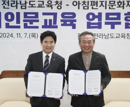 전남도교육청은 7일 본청 비즈니스실에서 아침편지문화재단과 독서인문교육 활성화를 위한 업무협약을 체결했다.