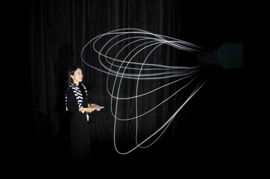 19일 서울 종로구 아트코리아랩에서 열린 '2024 아트코리아랩 페스티벌'에서 마르탕 메시에르의 '사이클'이 전시되고 있다. 사이클은 어두운 공간에서 여덟 개의 빛 줄기가 춤을 추듯 움직이고 펴지면서 조화와 혼돈을 선사하는 설치 작품이다.