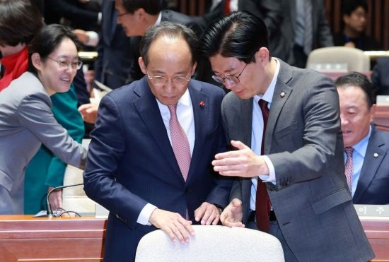 추경호 국민의힘 원내대표와 조정훈 의원이 2일 국회에서 열린 비상의원총회에서 대화하고 있다.
