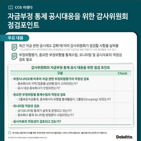 한국 딜로이트 그룹 지배기구발전센터는 ‘기업지배기구 인사이트(Insights)’ 제8호를 발간하고, 내년부터 의무화되는 ‘자금부정 통제 공시’ 제도에 대한 이사회 내 감사위원회 대응 방안 관련 핵심 점검 사항을 제시했다고 9일 밝혔다.