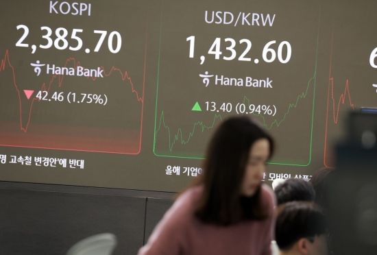 탄핵정국 장기화 조짐으로 인한 불안으로 9일 국내 증시는 코스피와 코스닥 모두 대폭 하락해 연중 최저점을 경신했고 원달러 환율은 1430원대에 올라섰다. 서울 을지로 하나은행 본점 딜링룸에서 직원들이 업무를 보고 있다. 허영한 기자