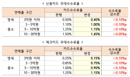 금융당국이 연매출 3억원 이하 가맹점의 카드수수료를 기존 0.5%에서 0.4%로 낮춰주기로 했다. 카드사 수익성 악화를 매출 감소에 따른 카드사 부담을 고려해 수수료율 재산정 주기는 3년에서 6년으로 늘린다.