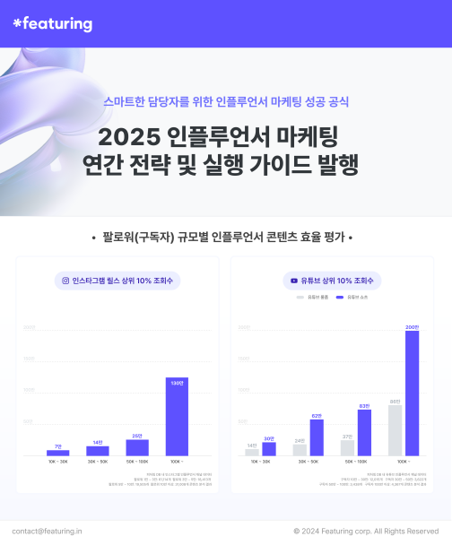 이번에 발행한 리포트는 3억 건 이상의 SNS 데이터를 실시간으로 수집·분석하는 피처링 인공지능(AI) 엔진과 1만2000개 이상의 고객사 협업 경험을 바탕으로 ▲인플루언서 선정 기준 ▲인스타그램·유튜브 콘텐츠 예상 원고료 ▲인플루언서 계약 시 체크리스트 ▲마케팅 효율 성과 측정 지표 등 실무에 참고할 수 있는 정보를 수록했다.