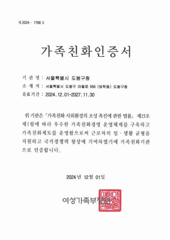 도봉구(구청장 오언석)가 여성가족부로부터 가족친화기관 재인증을 받았다고 밝혔다.