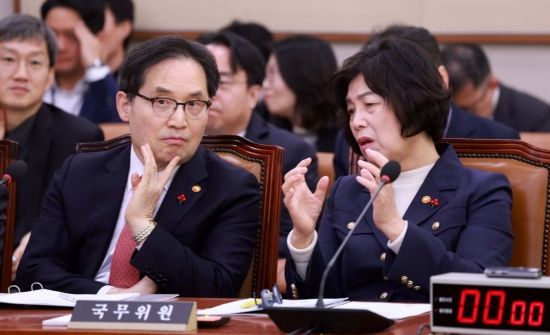 한기정 공정위원장과 강정애 국가보훈부 장관이 24일 국회에서 열린 법제사법위원회 전체회의에서 대화하고 있다.