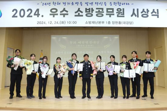 경기도소방재난본부가 24일 수원 팔달구 본부 청사 1층 대강당에서 연말 우수 소방공무원 및 민간유공자에 대한 시상식을 개최했다.