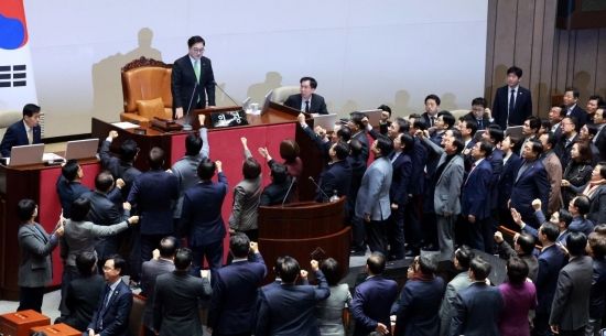 국민의힘 의원들이 27일 한덕수 국무총리 탄핵소추안이 상정된 국회 본회의에서 탄핵소추 가결 의결정족수(재적의원 과반수 찬성)를 문제 삼으며 우원식 의장에게 거센 항의를 하고 있다.