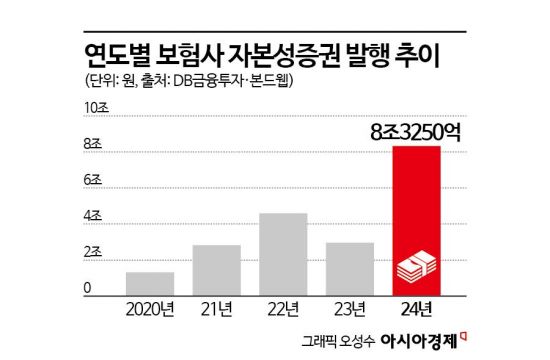 13일 DB금융투자에 따르면 지난해 보험사들은 8조3250억원 규모의 자본성증권을 발행했다. 자본성증권 발행이 8조원을 넘어선 것은 이번이 처음이다. 전년 대비로는 182.6% 증가했다. 국제회계기준(IFRS17) 적용을 일년 앞두고 보험사들이 대규모 자본성증권을 발행했던 2022년(4조5899억원)과 비교해도 증가세가 뚜렷했다. 지난해 보험사들이 역대 최대 실적을 쏟아낸 와중에도 이자를 내가며 돈을 빌리러 다닌 것이다.