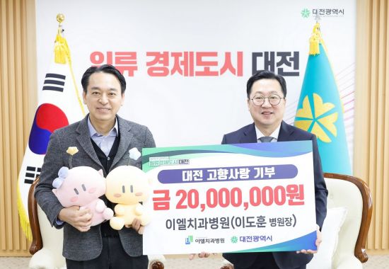 15일 대전시에 따르면 올해부터 고향사랑기부제 기부 한도액이 500만 원에서 2000만 원으로 상향된 후 대전 이엘치과병원 이도훈 병원장이 이날 시청을 찾아 이장우 대전시장에게 고향사랑기부금 2000만 원을 기탁했다.