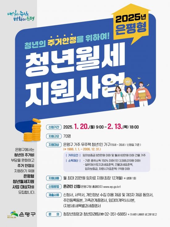 지원 대상은 신청일 기준 은평구에 주민등록을 두고 있는 19세에서 39세 무주택 1인 가구 청년이다. 신청 기간은 이달 20일부터 2월 13일까지이며, 신청 방법은 은평구청 누리집을 통해 온라인으로 하면 된다.