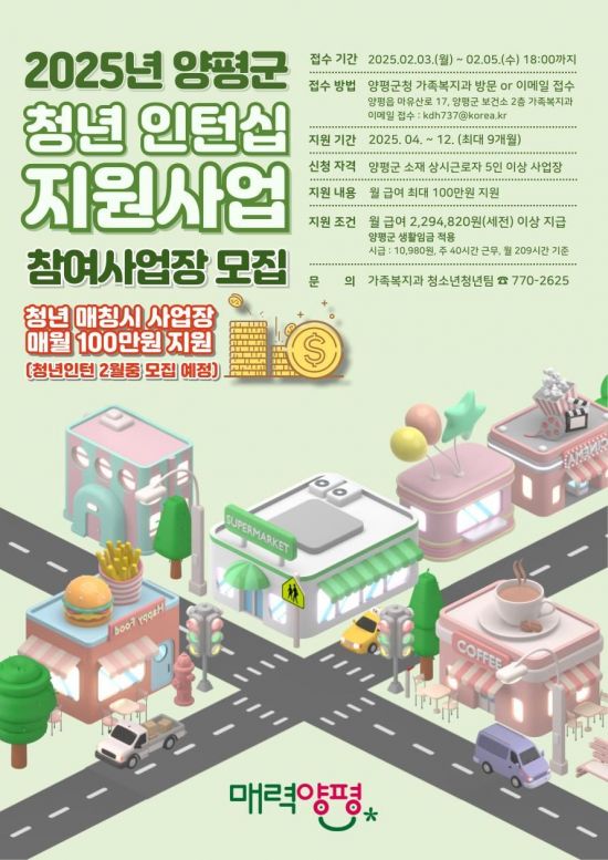 경기 양평군(군수 전진선)은 오는 2월 3일부터 5일까지 '청년 인턴십 지원 사업'에 대한 참여 사업장 모집을 실시한다고 20일 밝혔다.