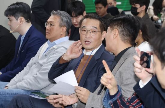 마영민 넥스트엘레베이션 대표(오른쪽 두번째)와 전화성 씨엔터테크 대표(오른쪽)가 20일 서울 강남구 팁스타운 팁스홀에서 넥스트엘레베이션과 씨엔티테크가 주최한 '리프 스타트 데모 데이'에 참석, 대화를 하고 있다.