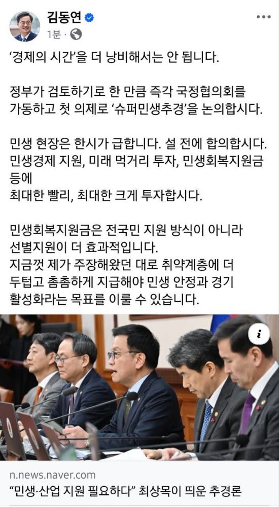 그는 "정부가 검토하기로 한 만큼 즉각 국정협의회를 가동하고 첫 의제로 ‘슈퍼민생추경’을 논의하자"며 "민생 현장은 한시가 급하다. 설 전에 합의해야 한다"고 강조했다.