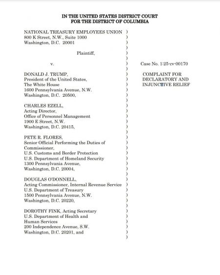 전미재무공무원노조(NTEU)가 도널드 트럼프 대통령과 미 인사관리국(OPM) 차기 국장인 찰스 에젤 등을 대상으로 행정명령 관련 소송을 제기했다고 21일(현지시간) 밝혔다. 사진은 소송장 원문 일부. 자료=소송장 갈무리