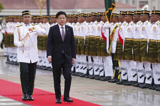 로렌스 웡 싱가포르 총리가 21일(현지시간) "높은 미중 상호 의존성"을 고려할 때 현 단계에서 미국이 중국과의 관계를 단절할 위험이 크지 않다고 평가했다. 사진은 웡(오른쪽) 총리가 지난 7일 말레이시아 푸트라자야에서 열리는 환영식에서 말레이시아 총리 안와르 이브라힘과의 회담에 앞서 의장대를 사열하는 모습. (AP·연합뉴스)