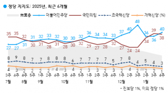 24일 여론조사업체 갤럽의 여론조사(21~23일 전국 18세 이상 1000명 대상으로 무선전화 전화조사원 인터뷰 방식으로 진행, 표본오차는 95% 신뢰수준에 ±3.1%포인트, 응답률은 16.4%)에 따르면 민주당 지지율은 지난주 조사와 비교해 4%포인트 오른 40%, 국민의힘은 1%포인트 하락한 38%를 기록했다. 양당 간 지지율 격차는 오차범위 이내다.