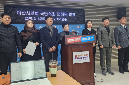 국민의힘 소속 충남 아산시의회 의원들이 4일 오전 시청 브리핑실에서 기자회견을 열고 홍성표 의장의 의원직 사퇴 등을 촉구했다.