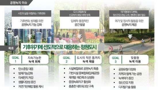 기본계획에서는 △녹색회복 △녹색채움 △녹색 이용이라는 3가지 목표를 정했다. 저출생과 고령화·1인가구 증가 등 인구구조 변화, 기후변화 대응, 공원의 질적 개선, 여가공간 확보, 스마트기술 발달 등 다양한 사회·환경 변화와 요구를 계획에 반영한다.