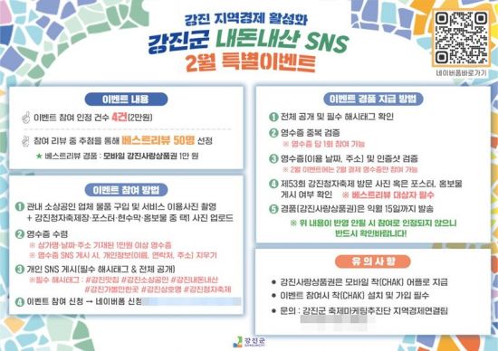 군은 지역경제 활성화를 위해 모바일(착) 강진사랑상품권 가맹점을 대폭 확대하기 위해 1월부터 '찾아가는 서비스'를 시행하고 있다. 담당 직원이 직접 상가를 방문해 착 가맹점에는 사용방법 등을 안내하고, 비가맹점은 회원가입 및 가맹점 신청을 하는 등의 내용 등의 홍보 활동을 펼치고 있다.