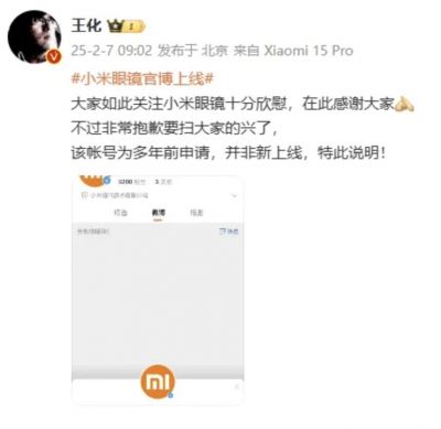 샤오미의 홍보 임원인 왕화 부장이 7일(현지시간) '웨이보' 게시글을 통해 이르면 올 상반기 샤오미가 인공지능(AI) 안경을 출시할 것이란 보도에 대해 부인했다. 사진=웨이보 갈무리