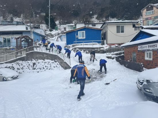 8일 오전부터 조합원 30여명이 울릉읍 관내 제설 장비 투입이 불가한 골목 등 주거밀집 취약지역을 찾아 제설작업을 펼쳤다.