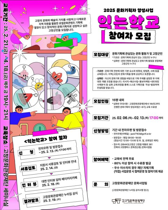 전북 고창문화관광재단이 오는 13일까지 문화기획자 양성사업 ‘익는학교’ 참여자를 모집한다.