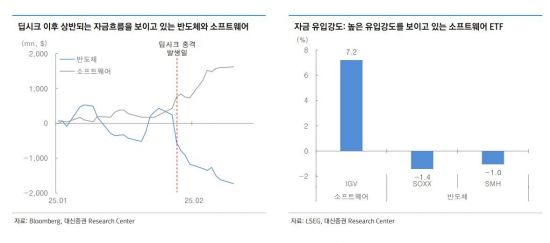 특히 박 연구원은 투자자금 역시 AI 반도체에서 AI 소프트웨어로 이동하고 있다는 점을 강조했다. 그는 "AI 시장은 크게 AI 반도체(컴퓨팅), AI 인프라(데이터 및 클라우드 시스템), 소프트웨어(AI 모델의 개발·배포·운영), 애플리케이션(최종 사용자 서비스)으로 연결되는데, 딥시크 충격 이후 반도체와 소프트웨어 업종이 상반되는 자금유입 흐름을 보이고 있다"고 지적했다. 그는 "반도체에서는 자금 유출이 지속되고 있으나, 소프트웨어에는 자금 유입이 이어지고 있다"고 말했다.