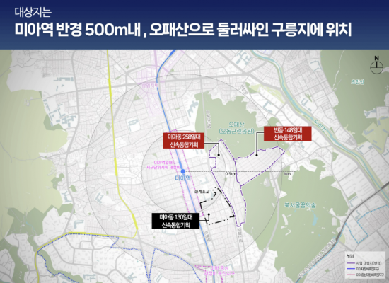 서울시는 강북구 미아동 258·번동 148 일대 2개소에 대한 신속통합기획을 확정했다고 11일 밝혔다. 연접 대상지 2개소 기획을 동시에 추진해 보행·녹지·경관 등이 유기적으로 연결되면서 사업 실현성을 획기적으로 높인 대규모 주거단지로 탈바꿈한다는 방침이다.