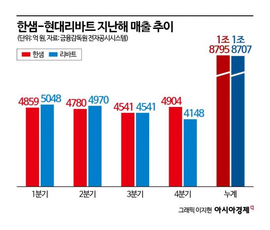 12일 금융감독원 전자공시시스템에 따르면 지난해 한샘과 현대리바트의 연간 매출은 각각 1조8795억원, 1조8707억원으로 집계됐다. 3분기 누적 기준으로 현대리바트가 한샘을 넘어섰지만 4분기 매출이 한샘 4904억원, 현대리바트 4148억원으로 역전되면서 결국 한샘이 1위를 수성했다.