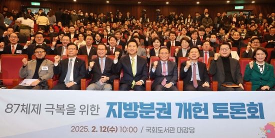 오세훈 서울시장과 권영세 국민의힘 비상대책위원장 등이 12일 국회도서관에서 열린 '87체제 극복을 위한 지방분권 개헌 토론회'에서 기념 촬영하고 있다.