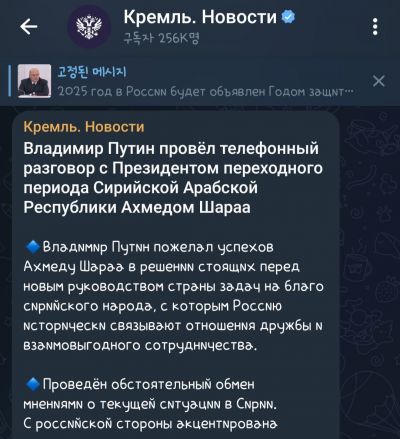 크렘린궁이 12일 텔레그램 성명에서 "푸틴 대통령은 알샤라 대통령에게 시리아 국민의 이익을 위해 새 지도부가 직면한 과제를 해결하는 데 성공하기를 바란다고 기원했다"고 밝혔다. 사진=크렘린궁 텔레그램 갈무리
