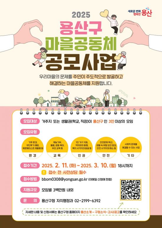 서울 용산구(구청장 박희영)가 다음 달 10일까지 ‘2025년 용산구 마을공동체 공모사업’ 참여자를 모집한다.