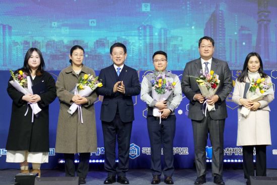 김영록 전라남도지사가 13일 영암 호텔현대바이라한에서 열린 ‘지자체-대학 협력기반 지역혁신사업(RIS) 성과공유회 및 지역발전토론회’에 참석, 유공자를 표창한 뒤 기념촬영을 하고 있다. 전남도 제공