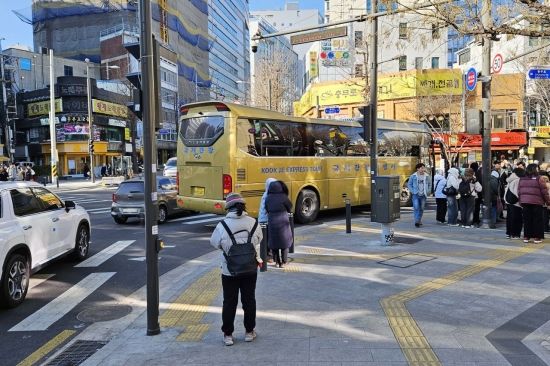 외국인 관광객을 태운 대형 관광버스가 사거리 횡단보도 한가운데 정차해 외국인 관광객들을 하차 시키고 있다. 우회전을 기다리는 차량들은 돌지 못했고, 관광객들과 길을 건너려고 기다리는 시민들이 뒤섞였다. 관광객들은 우왕좌왕, 시민들은 짜쯩.