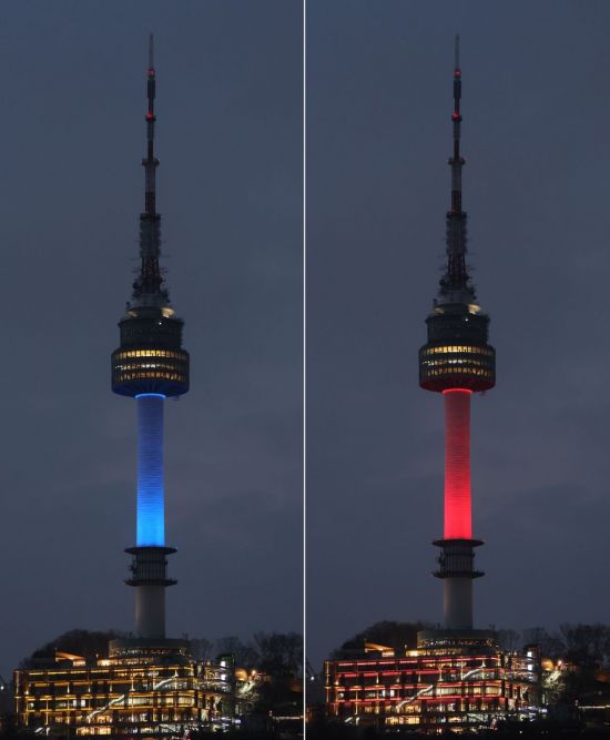오후 6시 30분쯤 점등한 서울타워 상단부에는 한일 양국의 국기를 형상화한 색상인 빨간색과 파란색 등이 교차로 켜졌고 하단부에는 60주년 공식 로고 이미지가 투사됐다.