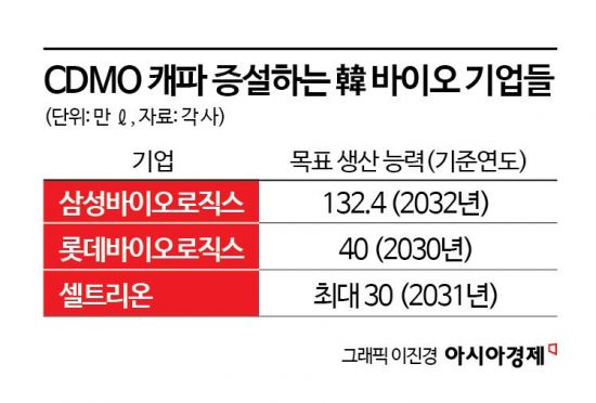 18일 업계에 따르면 현재 삼성바이오로직스는 인천 송도에 2032년까지 8공장까지 건설해 2032년 132만4000ℓ의 압도적 생산력을 확보한다는 목표다. 롯데바이오로직스도 36만ℓ 규모의 송도 바이오캠퍼스 공장을 짓고 있다. 1공장은 2027년 1월 본격 가동된다. 셀트리온도 CDMO 신사업 참여를 선언하고 국내에 최대 30만ℓ 규모의 공장 건설을 계획하고 있다. 로슈·베링거잉겔하임·존슨앤드존슨 등이 캐파 증설에 미온적인 상황에서 한국 기업들의 공격적인 투자로 4~5년 이후에는 글로벌 CDMO 순위까지 바뀔 전망이다. CDMO 기업들의 공격적인 증설은 글로벌 의약품 산업의 구조가 한국 기업에 유리하게 작동하기 때문이다.