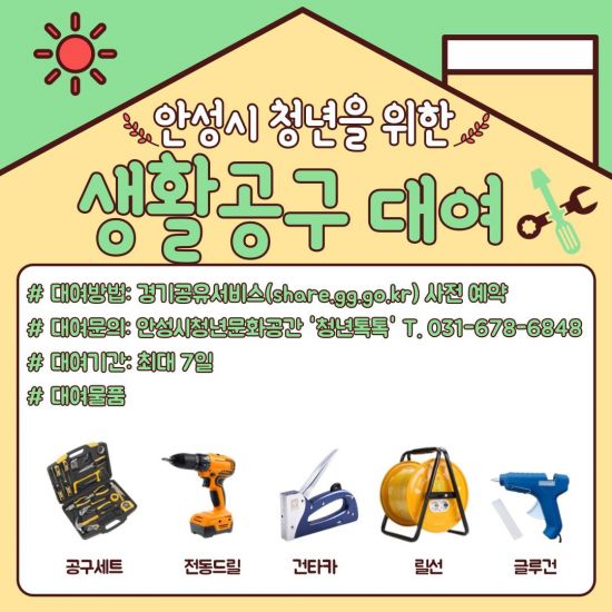 대여 물품은 전동 드릴, 공구세트, 건타카, 글루건, 릴선 등의 생활공구로, 대여 기간은 최대 7일이다. 안성시 생활권을 둔 19~39세 청년이면 '경기공유서비스' 홈페이지를 통해 사전신청한 후 안성시청년문화공간 ‘청년톡톡’을 방문하면 된다.
