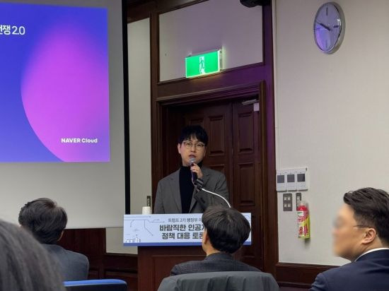 하정우 네이버클라우드 AI이노베이션 센터장이 18일 오전 국회도서관 소회의실에서 열린 '트럼프 2기 행정부 이후 바람직한 인공지능 정책 대응 토론회'에서 발표하고 있다. 이명환 기자