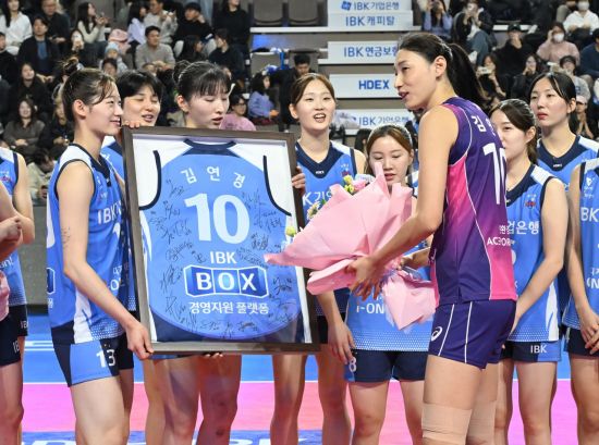 김연경(오른쪽)이 지난 16일 경기 화성종합체육관에서 열린 도드람 2024-2025 V리그 IBK기업은행과의 경기를 마친 뒤 IBK 선수들로부터 기념품을 전달받고 있다. [사진 제공= 한국배구연맹] 연합뉴스