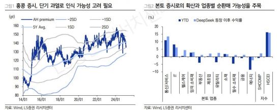 먼저 백 애널리스트는 "최근 홍콩 증시의 랠리는 딥시크 영향뿐 아니라 양호한 이익 기반의 건전한 상승"이라며 "여전히 본토 대비 이익 경로가 양호한 홍콩증시에 대한 선호 의견을 유지한다"고 설명했다. 그는 홍콩 증시가 단기적 과열로 인식될 가능성이 있다는 점을 짚으면서도 "차익실현보다는 경기민감주와 해당 비중이 높은 본토 증시로 확산할 가능성을 주목해야 한다"고 강조했다.
