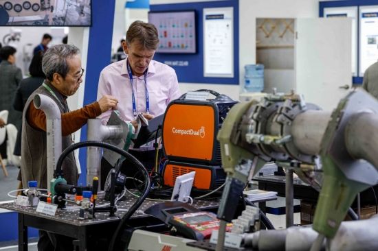19일 서울 강남구 코엑스에서 열린 '세미콘 코리아 2025'에서 외국인 국내 참가 기업 관계자와 의견을 나누고 있다.