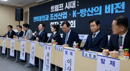 이재명 더불어민주당 대표가 19일 서울 마포구 한국방위산업진흥회에서 열린 '트럼프 시대 : 한미동맹과 조선산업·K-방산의 비전' 현장 간담회에서 발언하고 있다.