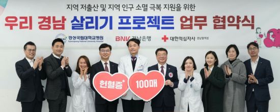 BNK경남은행은 19일 경상국립대학교병원·대한적십자사 경남혈액원과 ‘우리 경남 살리기 프로젝트 5호 업무 협약’을 체결했다.