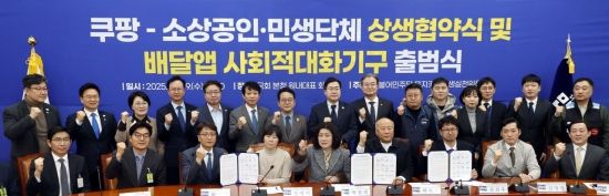 19일 국회에서 열린 쿠팡-소상공인·민생단체 상생협약 체결 및 배달앱 사회적대화기구 출범식에서 참석자들이 상생협약서를 들고 기념촬영하고 있다.