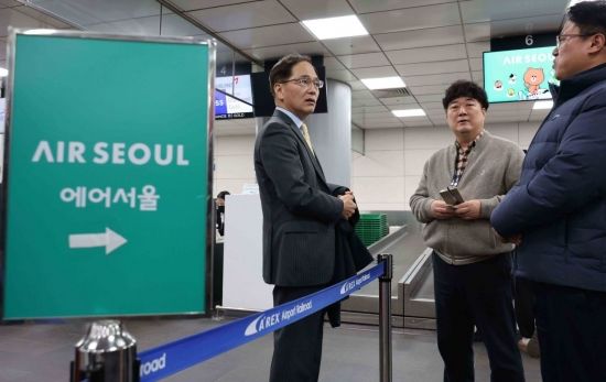 김중호 에어서울 대표이사(가운데)가 26일 서울 중구 공항철도 서울역 도심공항터미널에서 에어서울 수속 카운터를 점검하고 있다.