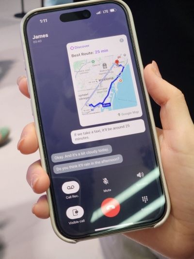 이날 부스에선 담당자가 핸드폰을 직접 들고 익시오와 구글을 접목한 기능을 시연했다. 휴대폰을 들고 전화를 하는 상황을 가정해 "여기에서 차로 25분 정도 걸릴거야"라고 말하니 익시오가 구글맵을 열고 경로를 추천해 줬다. "택시 타고 갈까"라고 하자 익시오가 "택시를 잡아드릴까요"라고 제안했다. 지금까지는 사용자 통화 내용을 분석해 맞춤형 영상을 추천하는 수준에 그쳤지만 앞으로는 통화 중 언급된 내용을 바탕으로 관련 장소나 사물을 즉시 검색하고 의견까지 내놓는 식이다. 익시오의 액셔너블 AI 기능은 연내 LG유플러스 모바일 고객에게 제공될 예정이다.