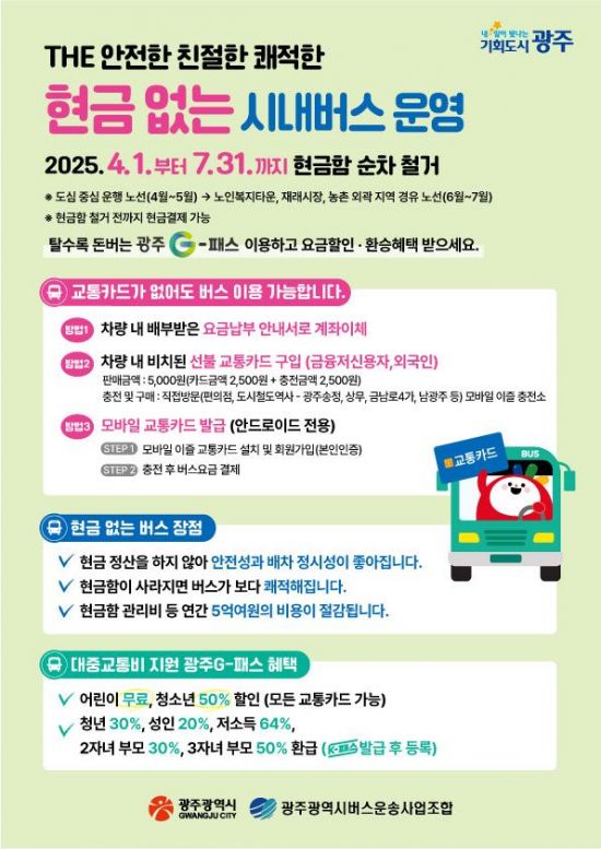 광주시는 오는 4~7월 순차적으로 ‘현금 없는 시내버스’를 도입한다고 13일 밝혔다.